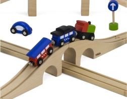 Rööpad, 2 vedurit, 4 vagunit, 3 autot ja lisad võimaldavad luua erinevaid radu ja stsenaariume – lihtsast ringist läbimõeldud linnani.