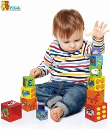Iga klotsi külg on kaunistatud erinevate motiividega, nagu loomad, numbrid, puuviljad ja transpordivahendid, mis rikastavad lapse kujutlusvõimet.