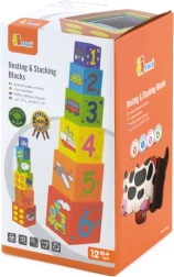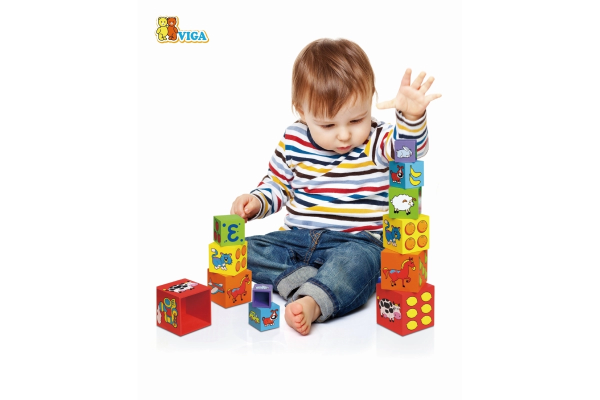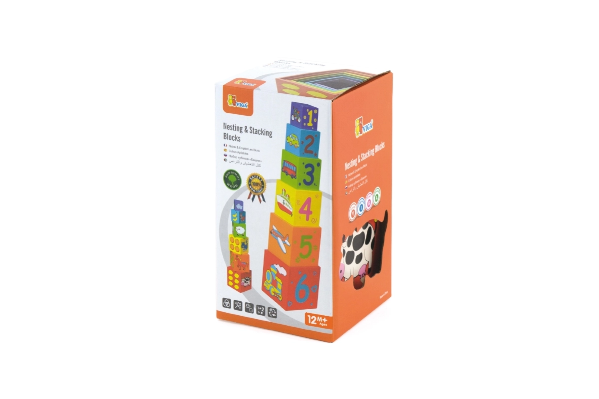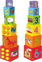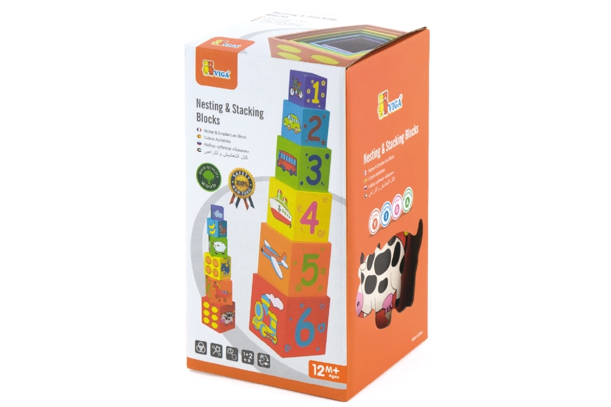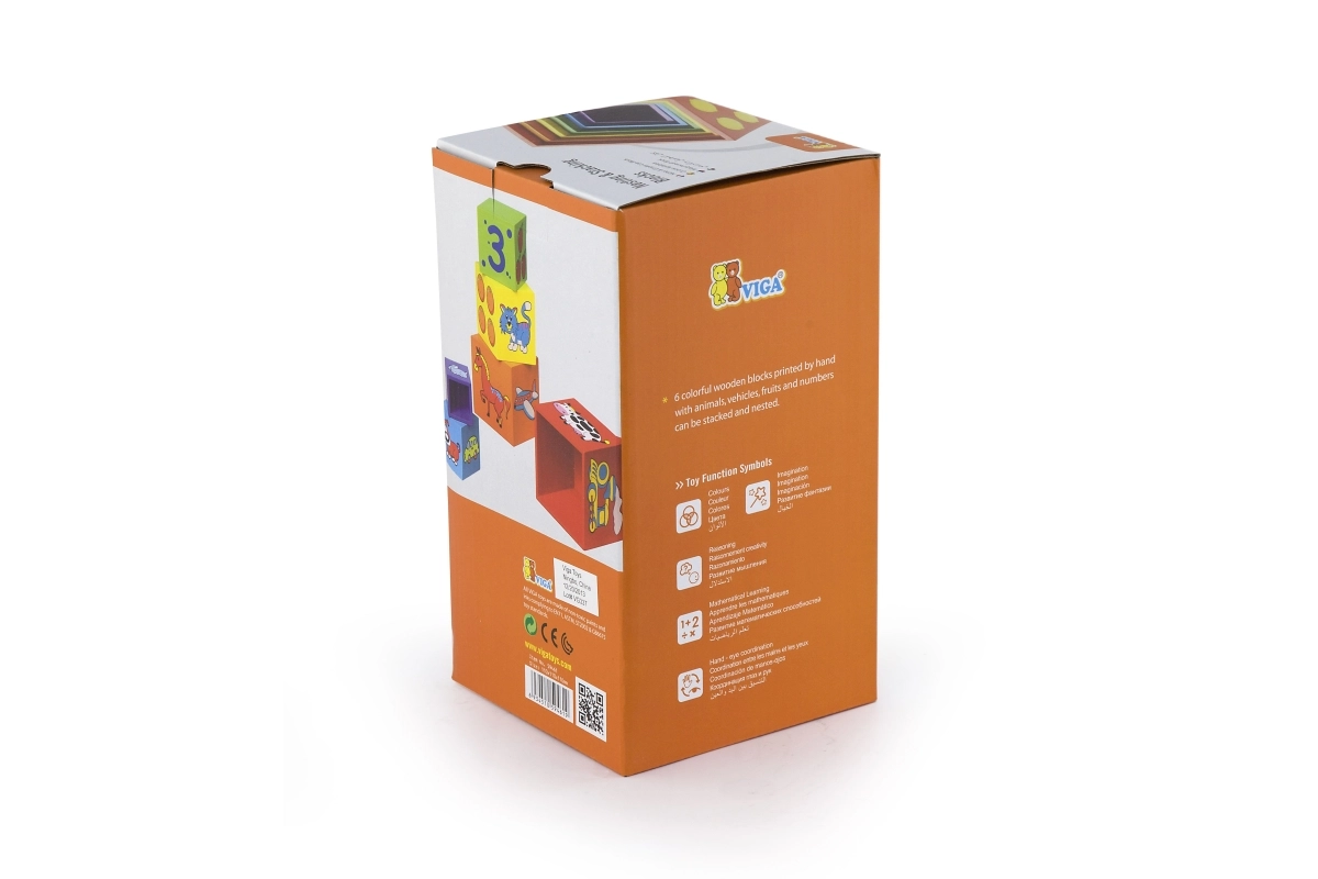 Iga klots on värviline ja illustreeritud piltidega – loomad, numbrid, puuviljad ja transport. See mitmekülgsus loob rohkelt võimalusi avastamiseks ja õppimiseks.