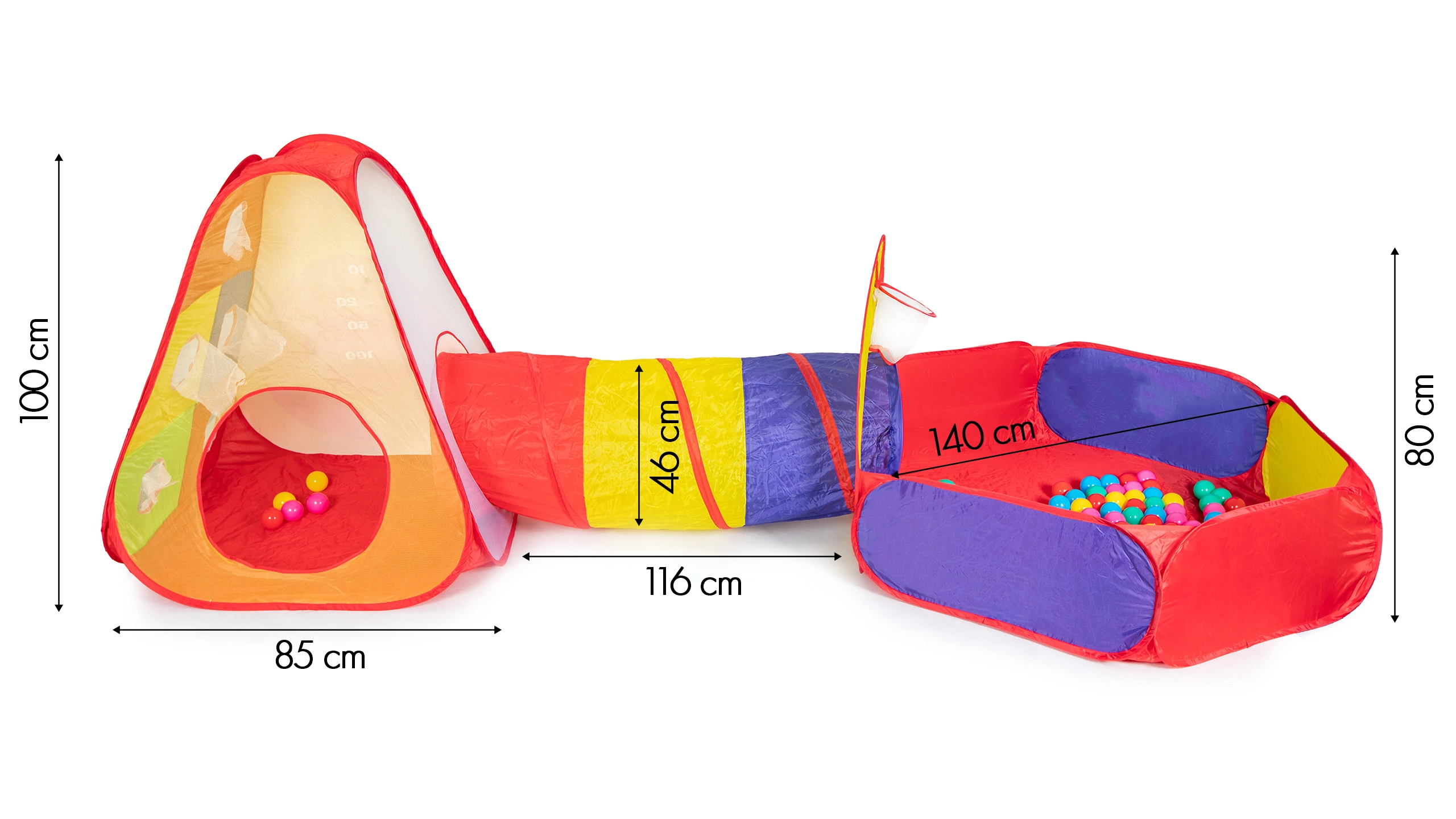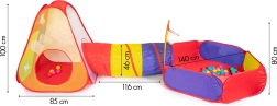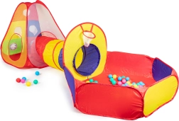 Lõbus laste mängukomplekt värvilise telgi, tunneli ja kuivpallibasseiniga koduseks ja õuemänguks. Komplektis on 100 värvilist palli, viskekorv ja märklauaseinad koos 3 takjapalliga. Iseavaneb konstruktsioon, kiire paigaldus ja kerge polüestrikate tagavad lihtsa kasutuse ja tundidepikkuse aktiivse lõbu.