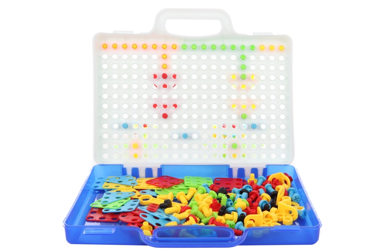 Kõik on paigutatud kaasaskantavasse kohvrisse, mille kaas toimib pegboardina, mistõttu on komplekti lihtne nii transportida kui ka korrastada. Suurepärane abivahend motoorika, käe-silma koordinatsiooni, loovuse ja kannatlikkuse arendamiseks.
