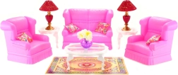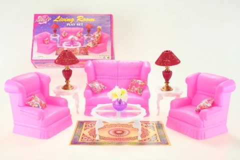 Stiilne GLORIE elutoa komplekt nukkudele muudab iga nukumaja hubaseks koduks. Komplektis on diivan, kaks tugitooli, diivanilaud ja abilauad, lambid ja dekoratsioonid. Ideaalne loovaks mänguks ja fantaasia arendamiseks. Täielik elutoa sisustus, detailirohked lisad ja vastupidav plastmaterjal rõõmustavad lapsi alates 3. eluaastast.