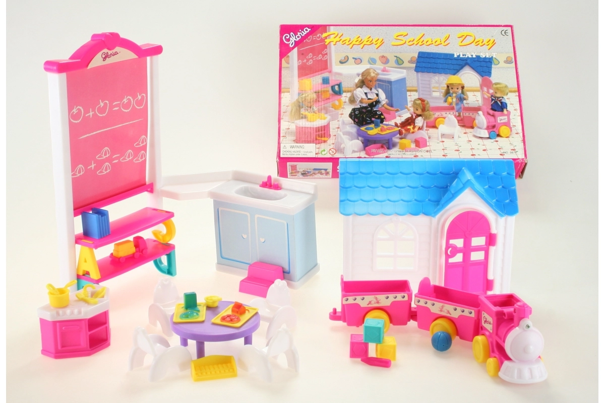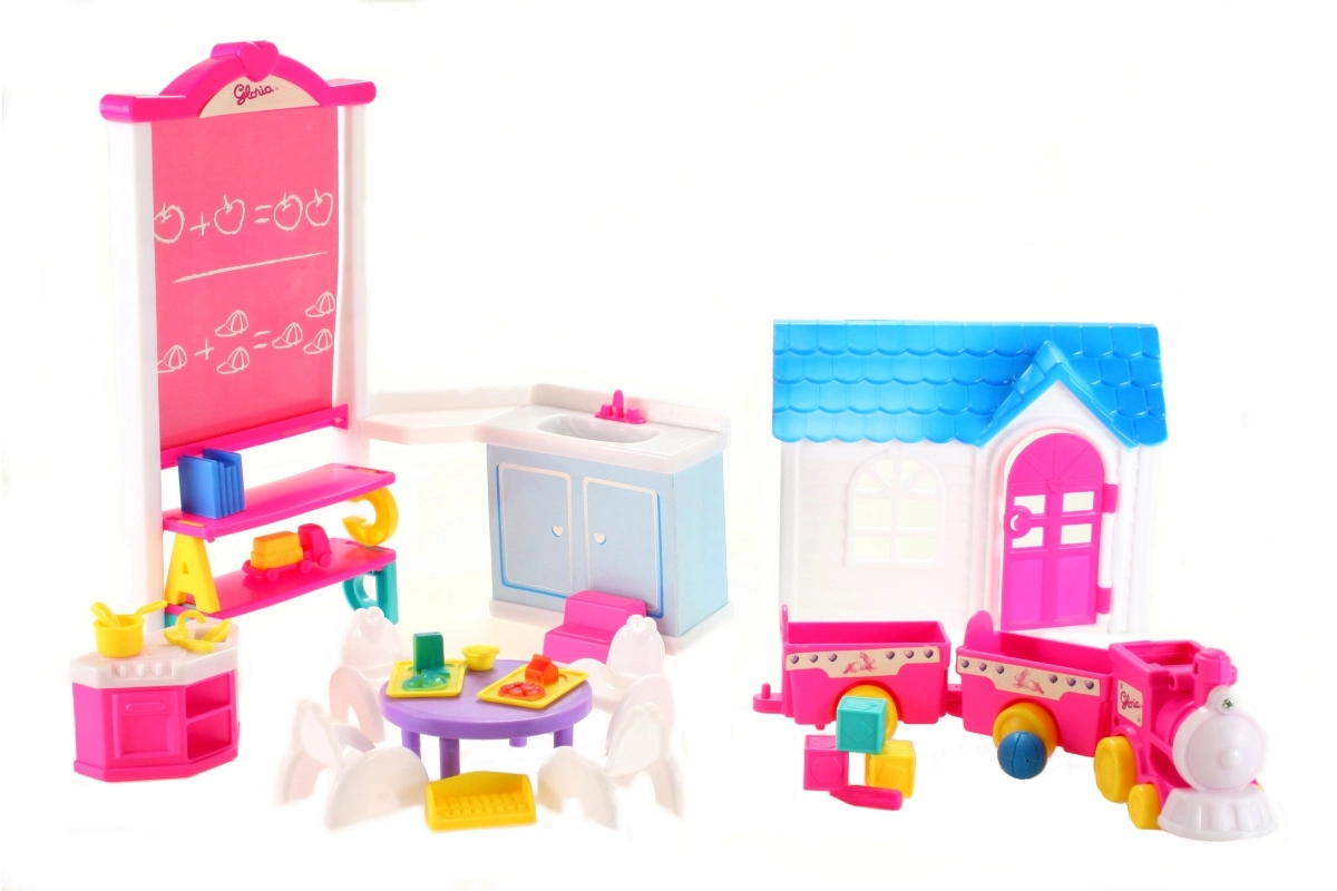 Loo nukkudele täiuslik mängukeskkond rikkalikult varustatud Glorie lasteaia komplektiga. Lapsed armastavad mängida lasteaeda realistlike elementidega, nagu tahvel riiulitega, toimiv kätepesukauss ja majake avanevate ustega. Komplekti kuuluvad ka rong, laud, toolid ning hulk väikseid lisasid, mänguasju ja nõusid – kõik loovateks stseenideks ja igapäevaseks mängurõõmuks.