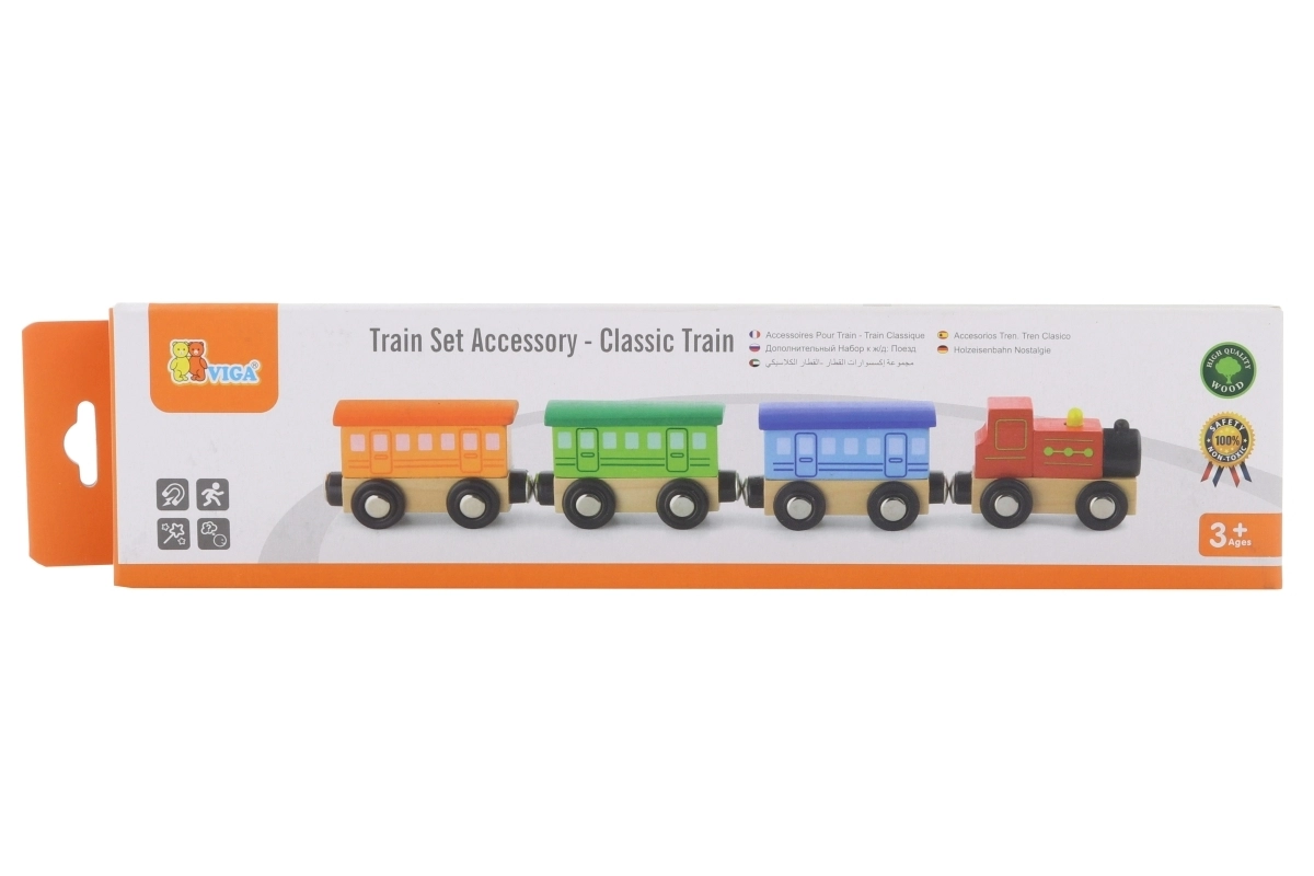 Puidust komplekt Klassikaline rong sisaldab 4 osa, mis on omavahel ühendatud magnetitega. Mänguasja on kujundanud tunnustatud puidust mänguasjade tootja Viga Toys. Komplekti saab kasutada eraldi mänguasjana või täiendusena teistele rongiradadele, konstruktoritele ja komplektidele.