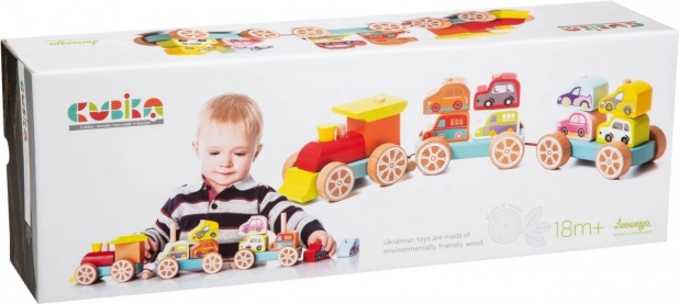 See värviline puidust pusle sisaldab 14 detaili, millest lapsed saavad kokku panna rongi kahe vaguni ja kaheksa autoga. Mängides üksikute detailidega arendavad nad ka oma senso-motoorseid oskusi, loogilist mõtlemist ja loovust.