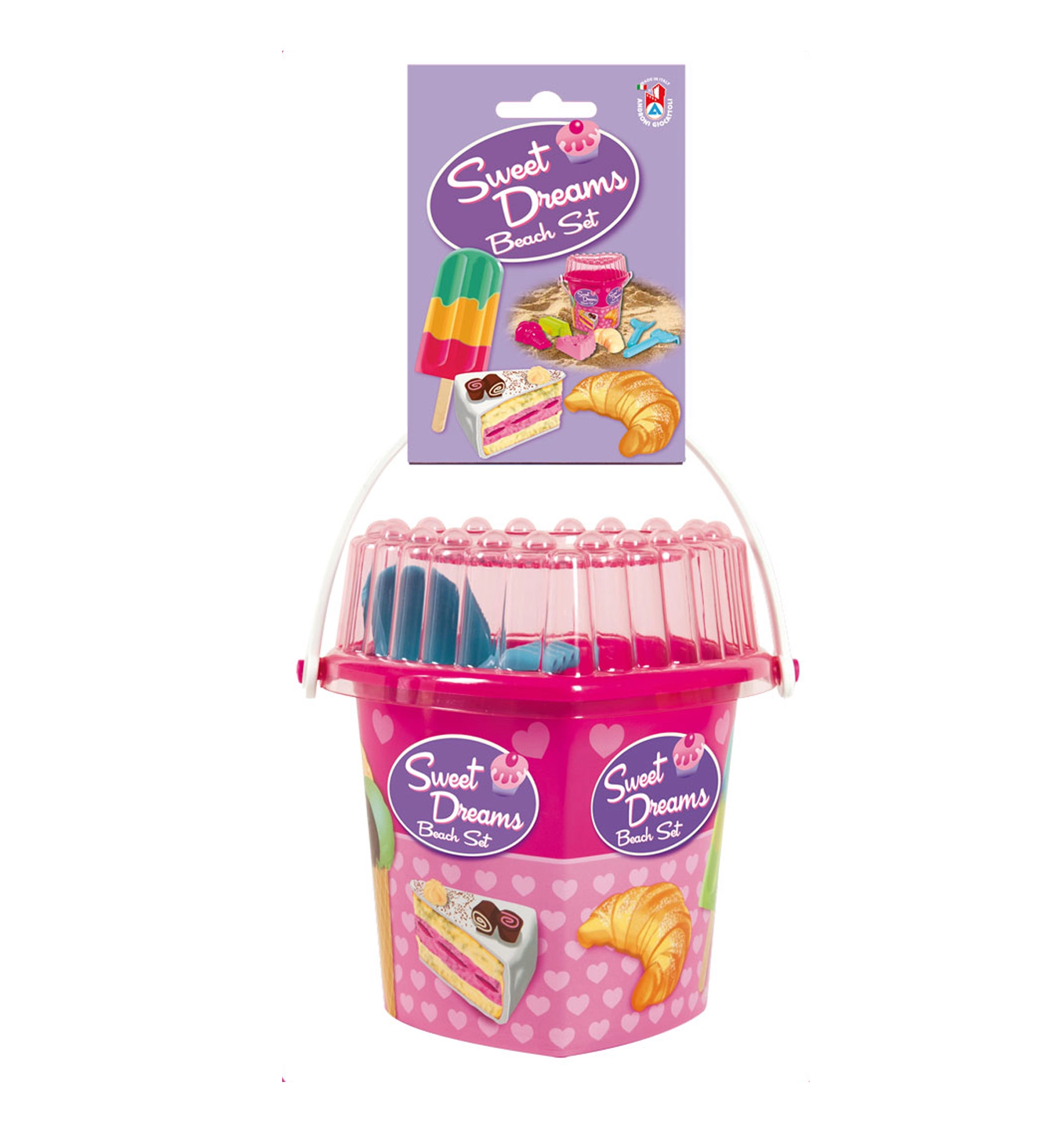 Lõbus Androni Kondiitriäri liivakomplekt rõõmustab väikseid pagareid ja jäätisemüüjaid alates 12. elukuust. Komplektis on 8 kvaliteetset plastdetaili, mis on valmistatud Itaalias: südamekujuline ämber kaanega, labidas ja rehad ning 4 kondiitrivormi (pöörisjäätis, pulgajäätis, võrest koogike, croissant). Kerge, ohutu ja ideaalne nii mänguväljakule kui ka randa.