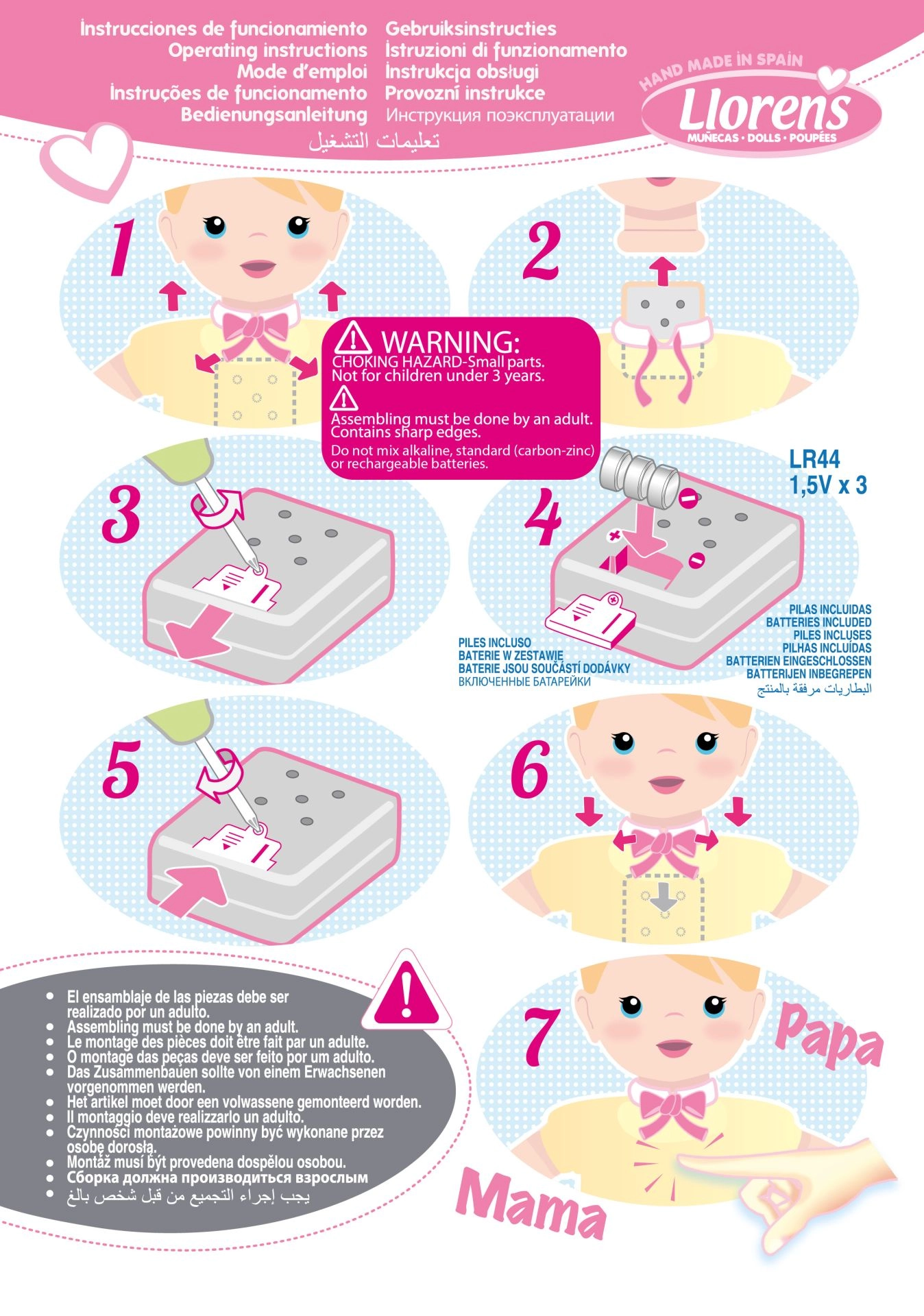 Nukk jäljendab päris beebit naeru ning sõnadega „ema“ ja „isa“, kui vajutada rinnale.