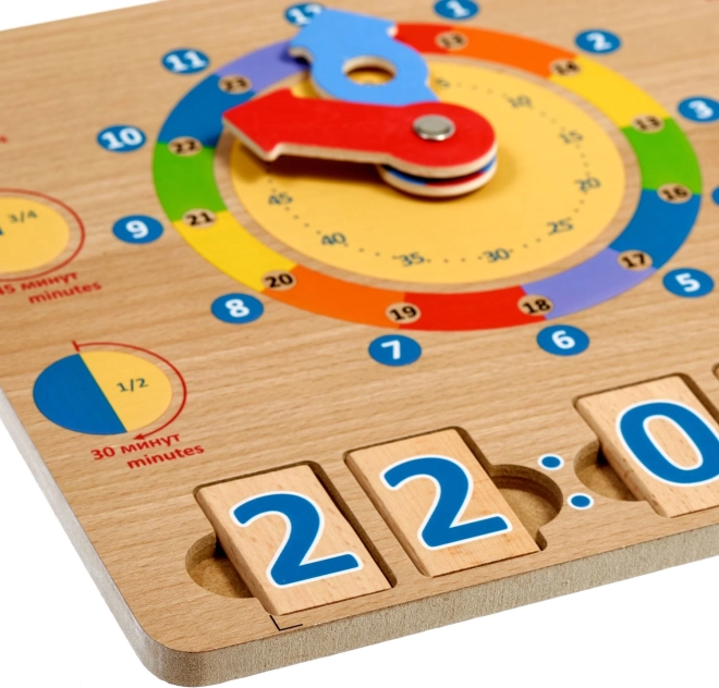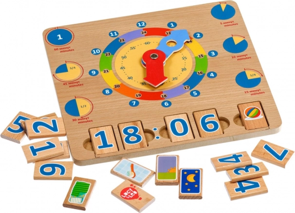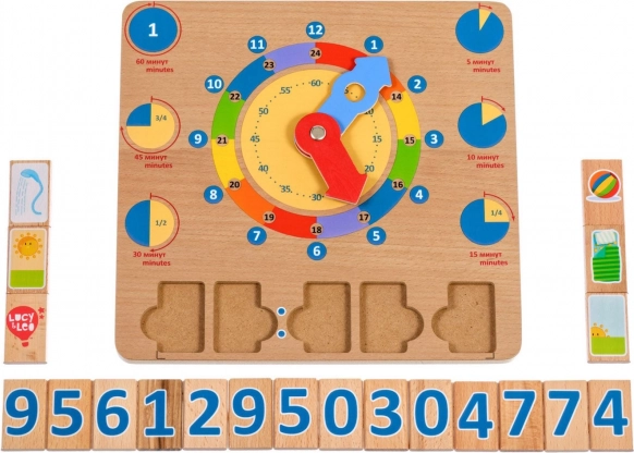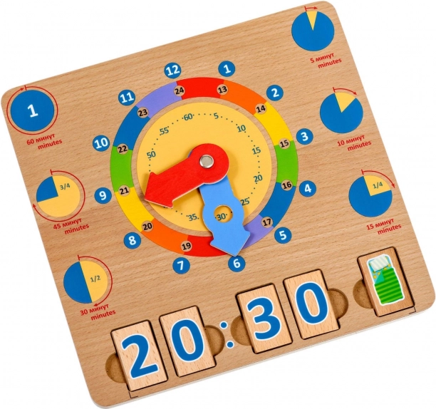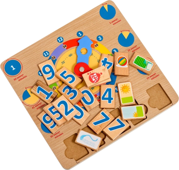 Puidust mänguplaat Õpime kella on suurepärane didaktiline vahend, mis toetab loomulikku õppimist läbi mängu. Suured värvilised seierid ja selgelt eristatud ajasegmendid aitavad lastel hõlpsamini mõista tunde, minuteid ning päeva tegevusi kindlatel kellaaegadel.