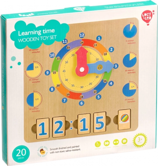 Komplektis on 14 numbriklotsi ja 6 päevategevuste pildiklotsi. Neli ajaklotsi saab asetada vastavatesse avadesse, et moodustada digi-kellaaeg, samal ajal kui viies klots kujutab vastavat tegevust. Nii seovad lapsed visuaalselt analoogkella digitaalse esitusviisiga ja igapäevase päevakavaga.
