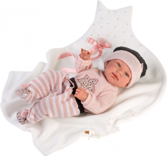 Stiilne 3-osaline LLORENS New Borni nuku riietus suurusele 43–44 cm rõõmustab realistliku välimuse ja kvaliteetse viimistlusega. Komplekt sisaldab omavahel sobitatud esemeid ja dekoratiivset tekikest – ideaalne mähkimiseks ja rollimängudeks. Valmistatud Hispaanias, pakendatud praktilise riidepuuga. Kvaliteetsed materjalid, täpne õmblus ja täiuslik lõige standardmõõdus nukkudele.