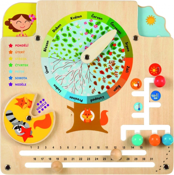 LUCY & LEO puidust looduse kalender on ideaalne vahend mänguliseks õppimiseks. Plaadi keskel on lehtpuust viljapuu koos 12 kuu näidikuga, mille abil seostavad lapsed hõlpsasti talve lumega, kevade õitega, suve viljadega ja sügise langevate lehtedega. Samal ajal õpivad lapsed tundma nädalapäevi, päevade arvu kuus, ilma, temperatuuri ja sobivat riietust erinevate olude jaoks.
