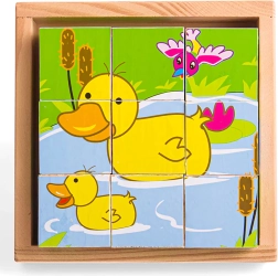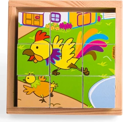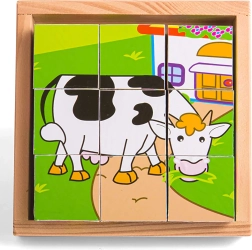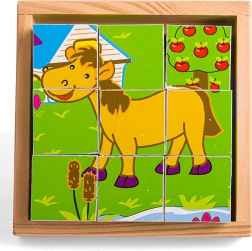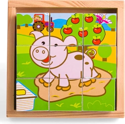 Üheksa vastupidavat puidust klotsi moodustavad kokku kuus armsat loomapilti. Lapsed saavad klotse pöörata, kombineerida ja luua, mis arendab loomulikult peenmotoorikat, nõtkust ja keskendumisvõimet. Komplektis on puidust alus lihtsaks kokkupanekuks ja turvaliseks hoiustamiseks – ideaalne nii koju kui ka reisile.