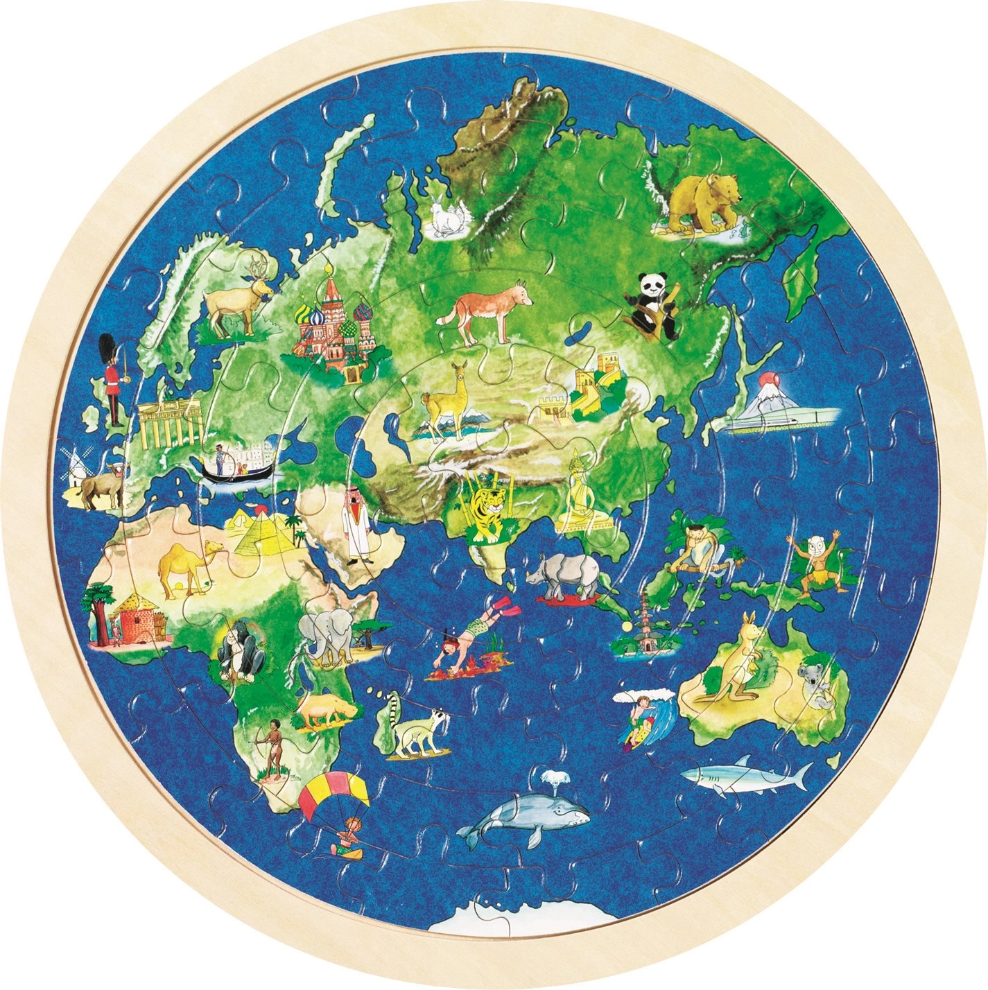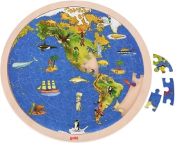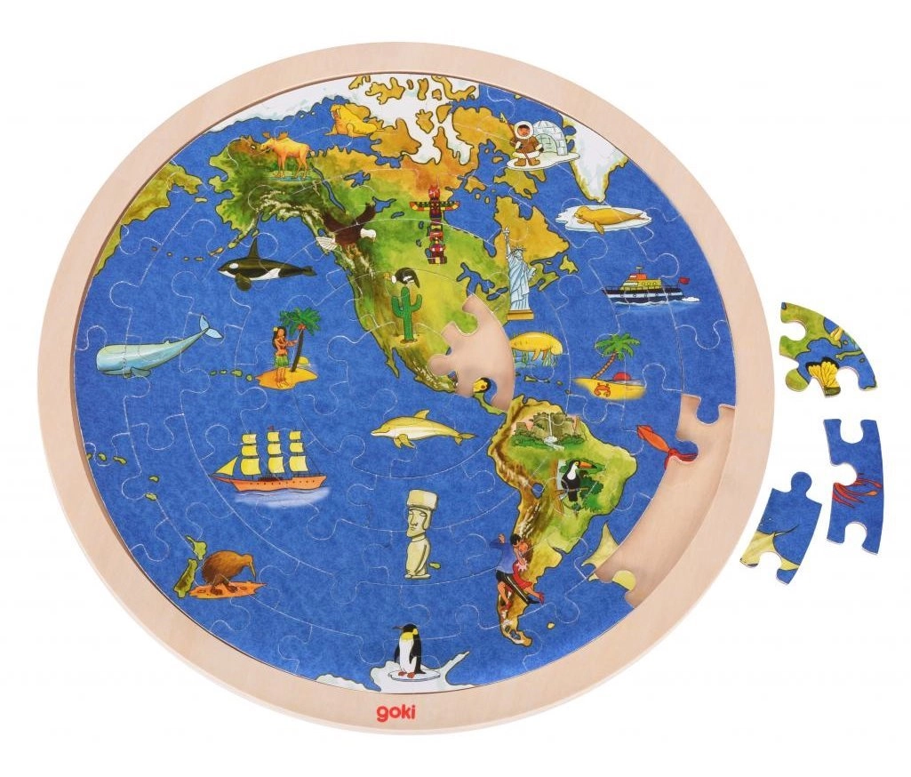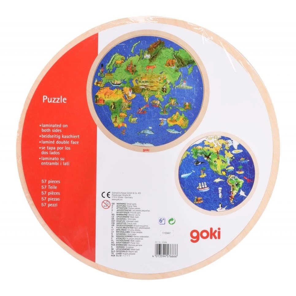 See kahepoolne GOKI puidust pusle ühendab lõbu ja õppimise. Iga külg kujutab üht poolkera selgete illustratsioonidega mandritest, loomadest ja vaatamisväärsustest, mis motiveerivad lapsi maailma avastama. Freesitud äär muudab kokkupaneku lihtsamaks ja suurendab edu ka väiksematel lastel.