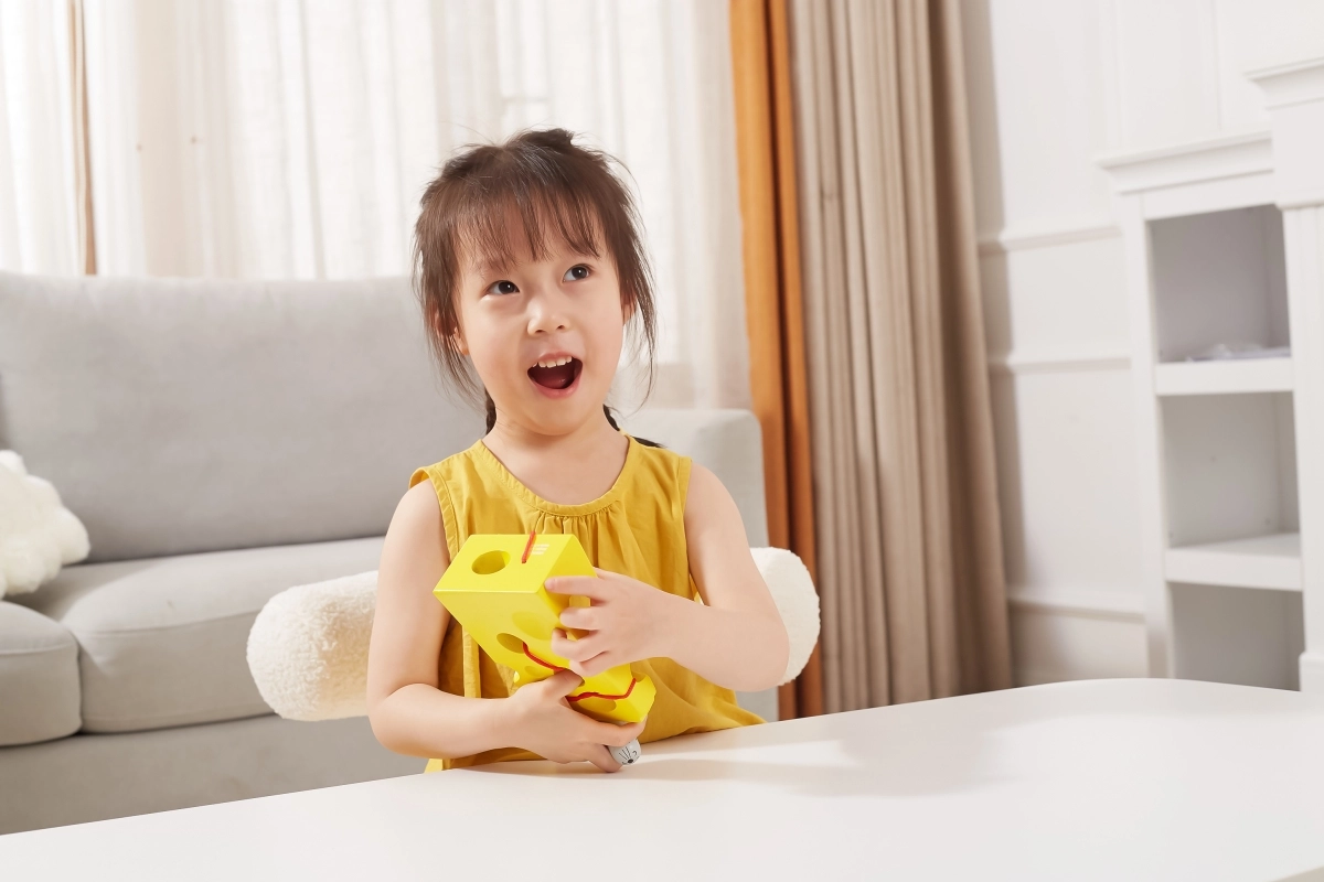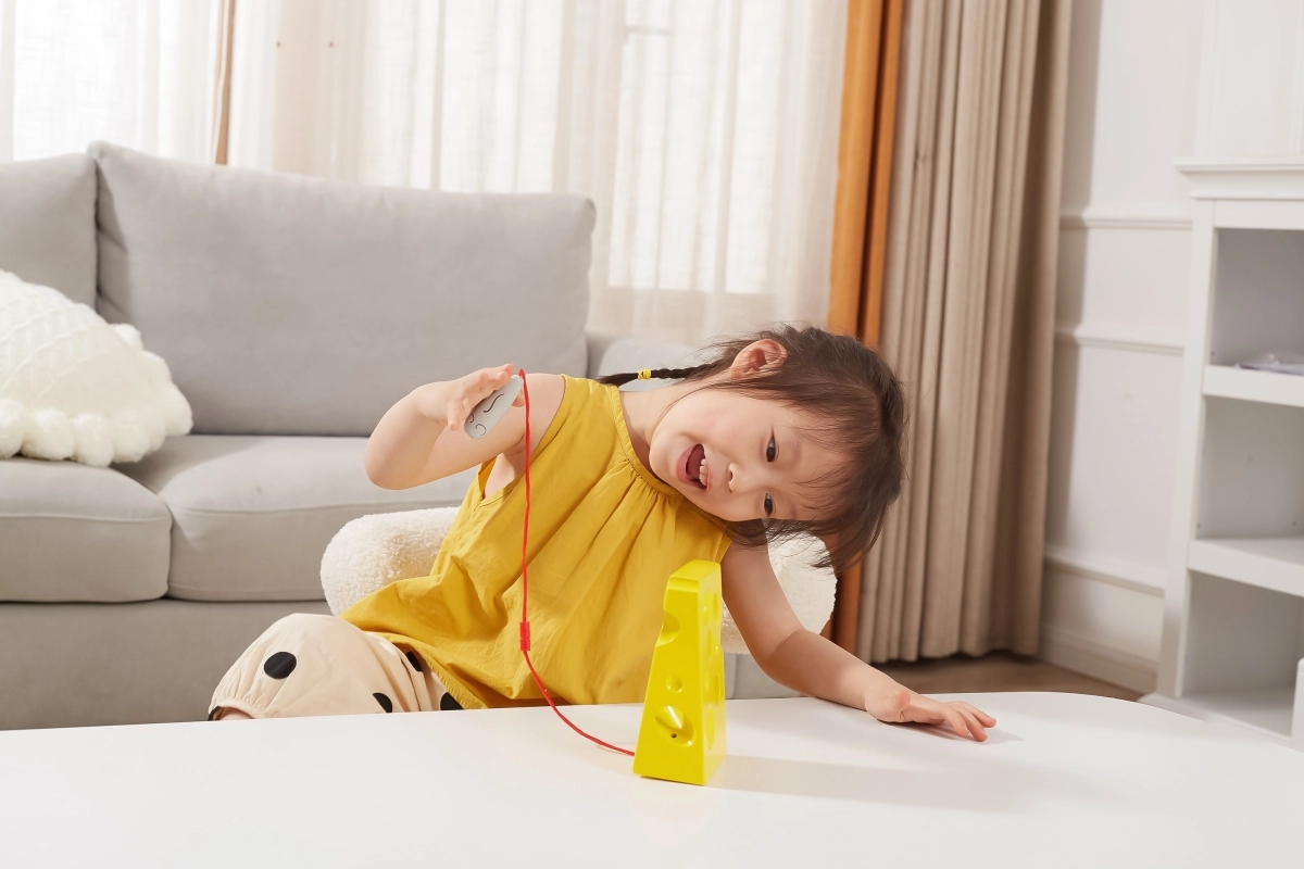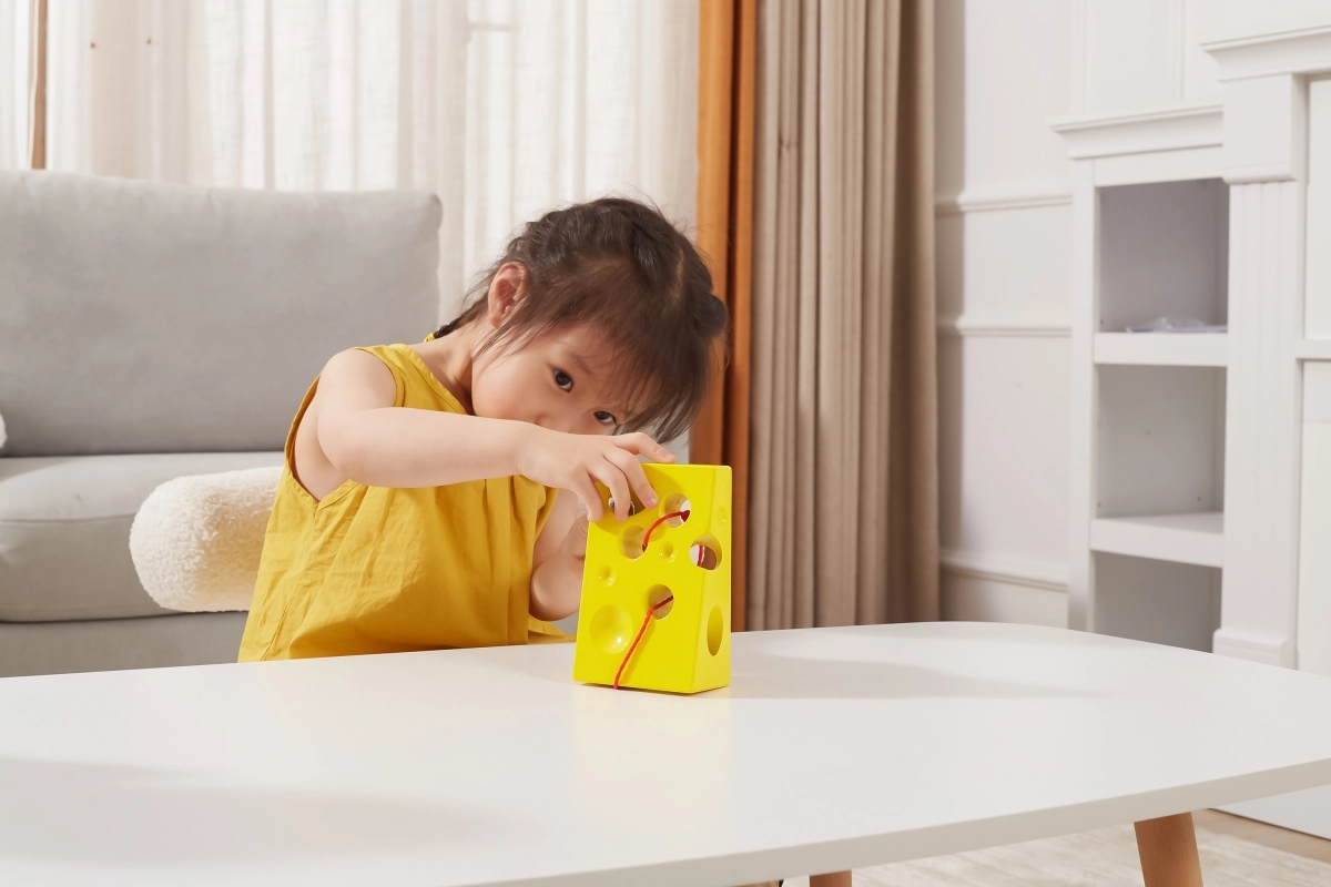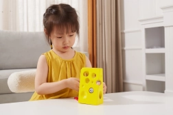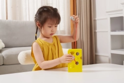 See kollane „juust” avade ja punase hiirekesega nööriga innustab lapsi sõrmi lõbusal viisil treenima. Põimimine eri kohtades asuvate avade kaudu toetab käelist osavust, liigutuste sümmeetriat ja loogilist mõtlemist.