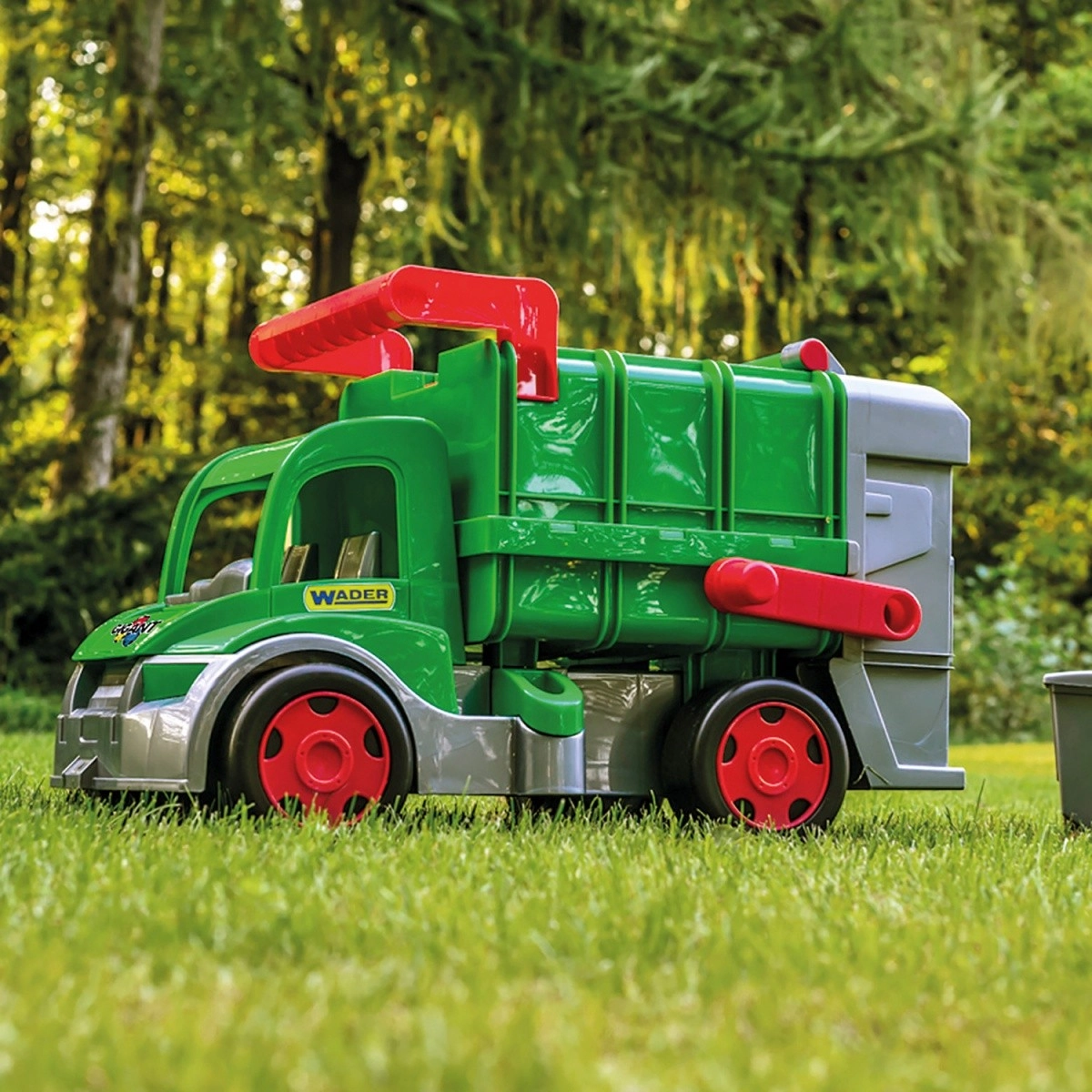 Prügiveoauto WADER GIGANT FARMER toob lasteni realistliku linnapuhastuse mängu. Tänu liikuvale tõstukile saab kaasasoleva konteineri hõlpsalt tühjendada, avatav tagaluuk lihtsustab peale- ja mahalaadimist ning vabalt veerevad rattad tagavad sujuva liikumise. Kandevõime kuni 50 kg lubab lastel autole istuda ja hoida kinni praktilisest ülemisest käepidemest, samal ajal kui eesmine haak võimaldab pukseerimist või ühendamist teise sõiduki või nööriga.