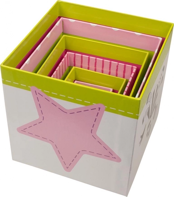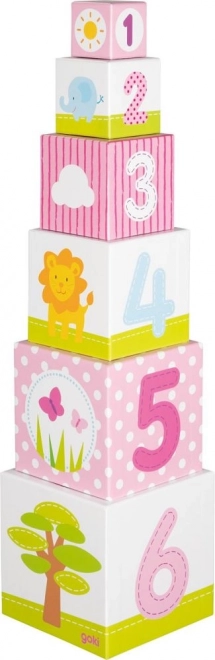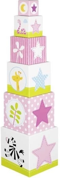 Komplektis on 6 tugevast kartongist kuupi, mida saab laduda kõrgeks torniks või üksteise sisse paigutada. Iga kuup on kaunistatud sõbralike loomade, taimede ja numbrite illustratsioonidega, mis aitavad lastel mängulisel moel arendada põhioskusi ja kannatlikkust.