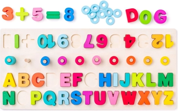 Avastage õppemaailm, kus lõbu kohtub kasulikkusega. Puidust haridusplaat pakub lastele lisaks tähtede ja numbrite tundmaõppimisele ka põhiliste matemaatiliste tehete harjutamist. Plaadil on eemaldatavad tükid numbrite, matemaatiliste sümbolite ja kogu tähestikuga erksates värvides. Kümme puidust pulka värviliste rõngastega võimaldab visuaalset ja taktiilset õpet.