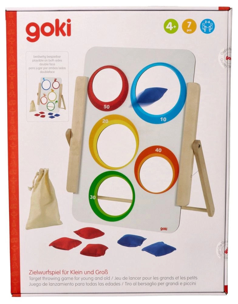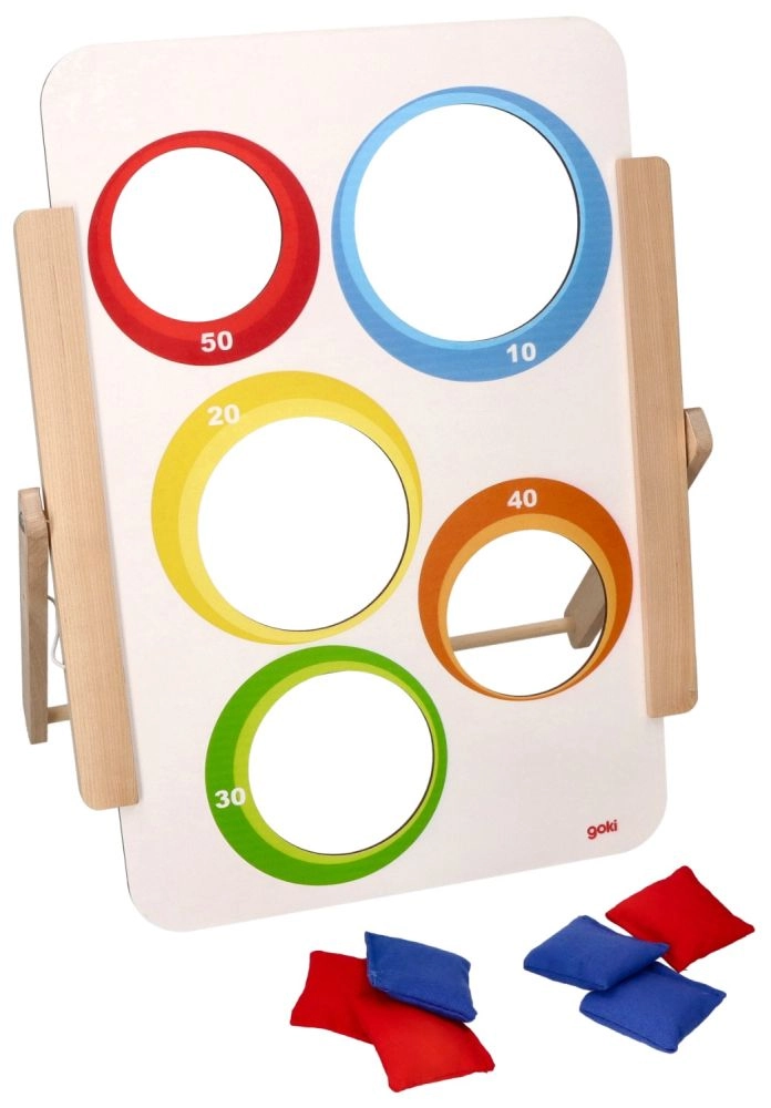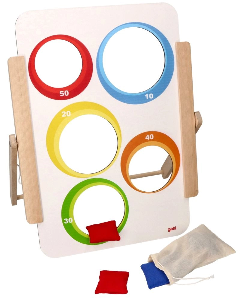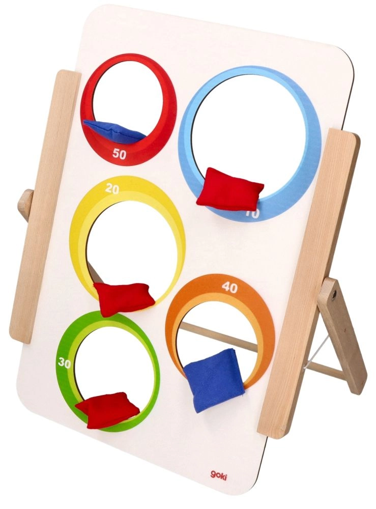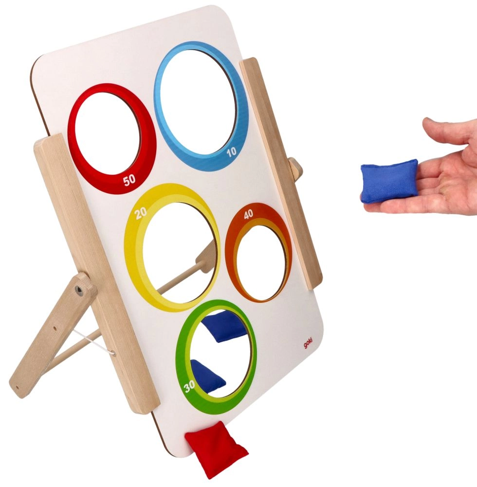 Goki viskemäng sihtmärgile pakub lihtsat, kuid haaravat lõbu nii väikestele kui suurtele. Puidust tahvlil on viis ava – ühel poolel loomapildid ja teisel poolel nummerdatud punktiväärtused (10–50). Lapsed harjutavad täpsust, keskendumist ja peenmotoorikat, võisteldes samal ajal võimalikult kõrge skoori nimel.