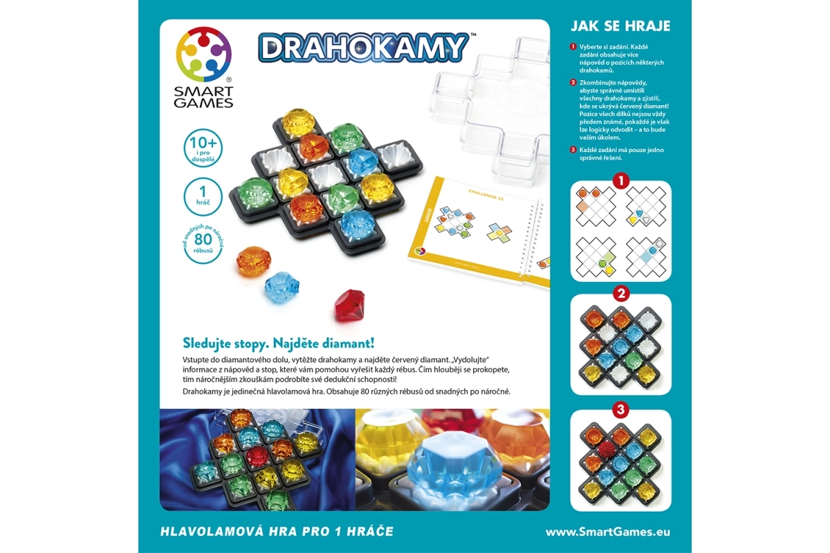 Mäng Drahokivid kuulub populaarsesse SmartGamesi loogikamängude sarja, mis on mõeldud eelkõige ühele mängijale. Iga ülesanne sisaldab ainulaadset vihjete komplekti kalliskivide asukohtade kohta. Sinu ülesanne on paigutada kõik tükid õigesti mängulauale ja paljastada punase teemandi asukoht. Iga tükk on ainulaadne ja igal ülesandel on ainult üks lahendus.