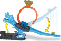 Alista dinosaurus ja päästa linn Hot Wheels City T‑Rexi silmuse mängukomplektiga. Komplektis on võimas stardiseade, 22,5 cm silmus ja rada, mis viib läbi sinise T‑Rexi lõugade. Õnnestunud tabamuse järel muutuvad T‑Rexi silmad raevukollastest X‑märgiks. Karbis on 1 metallist auto mõõtkavas 1:64 ning komplekti saab ühendada teiste Hot Wheels radadega.