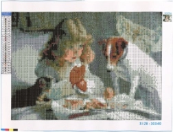 Detailne motiiv tüdrukust ja koerakesest suuruses 30 × 40 cm särab valmides kaunilt ja mõjub igas interjööris raamitatuna eriti stiilselt.