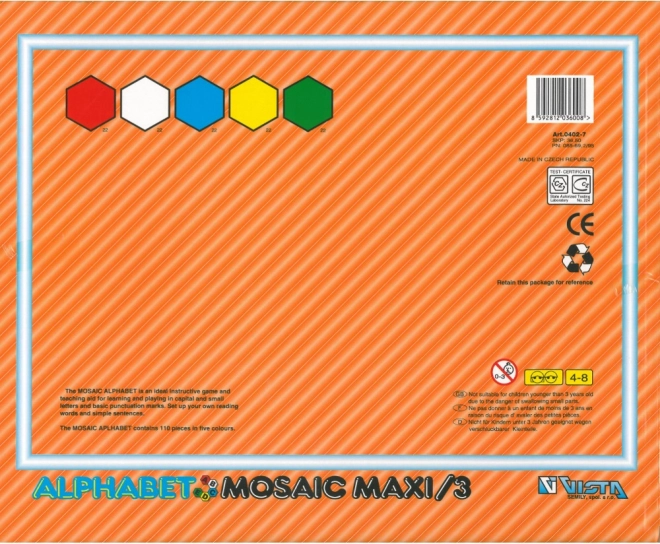 Avastage tähtede maailma värviküllase Alphabet Mosaic Maxi komplektiga. Tänu suurtele tükkidele kollases, punases, rohelises, sinises ja valges värvitoonis tutvuvad lapsed mänguliselt inglise tähestikuga, õpivad kokku panema lihtsaid sõnu ning arendavad kujutlusvõimet ja kannatlikkust.