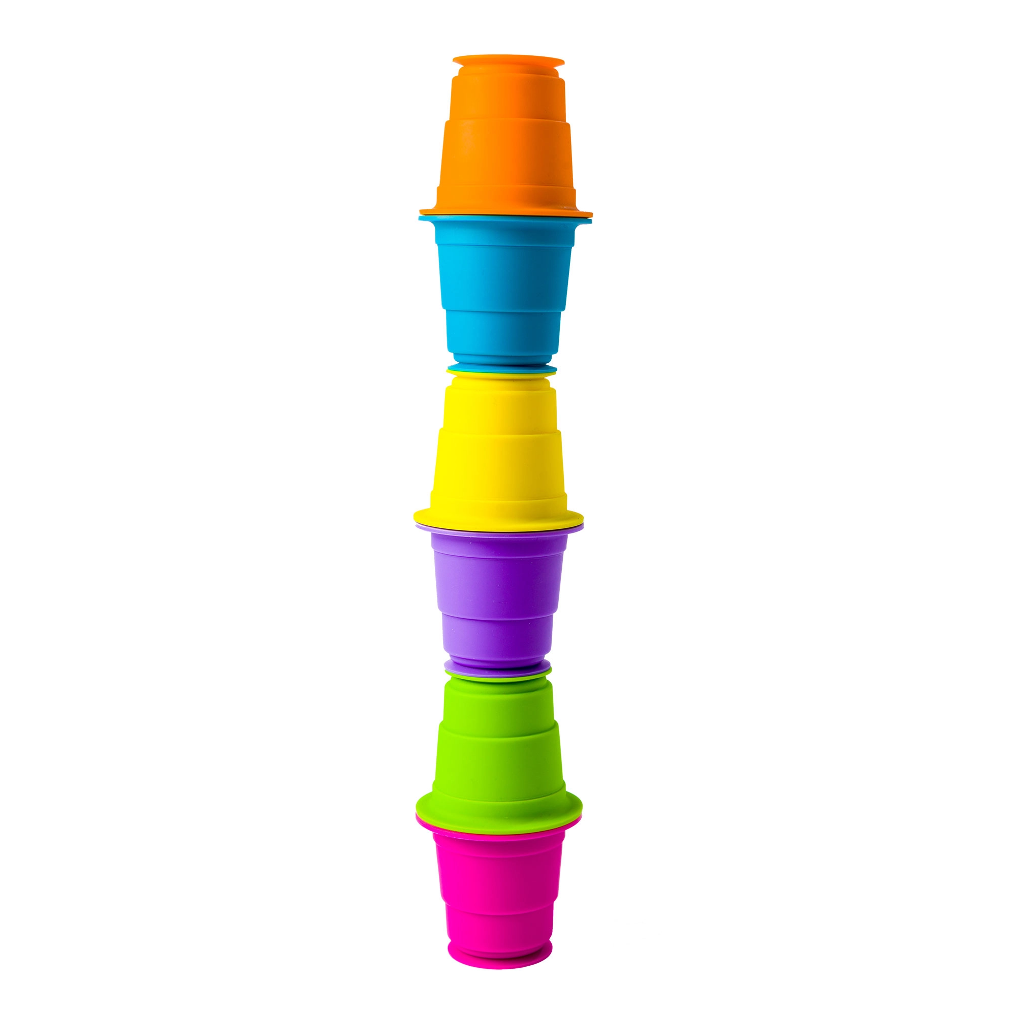 Erineva suurusega tasse saab laduda torniks või üksteise sisse. Lapsed harjutavad peenmotoorikat, käe-silma koordineerimist ja loogilist mõtlemist.