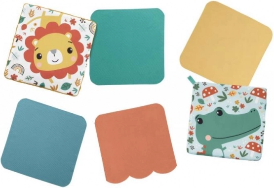 Värviliste kangaste komplekt mänguliste mustritega julgustab tõmbama ja muljuma, arendades peenmotoorikat ja puutetundlikkust.