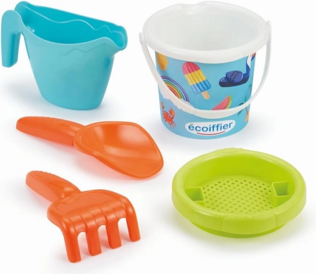 Laste ämber suvekujundusega ja praktiliste liival mängimise tarvikutega: kastekann, sõel, rehad ja labidake.