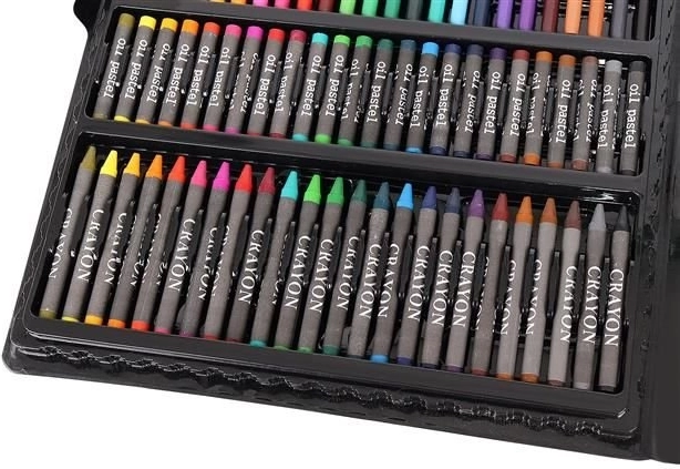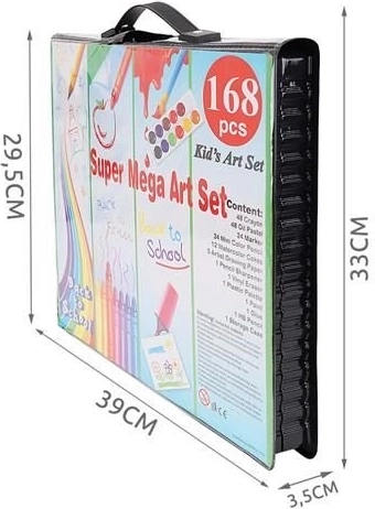 Super Mega Kunstitarvete Komplekt 168 tk pakub kõike, mida vajate kunstiteoste loomiseks: 24 värvipliiatsit, 24 vildikat, 48 õlipastellkreidat, 48 vahapastellkreidat, 12 akvarellvärvi ja palju muud. Kõik tarvikud on elegantselt paigutatud praktilisse vutlarisse, mis tagab lihtsa ligipääsu ja hea ülevaate.