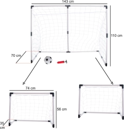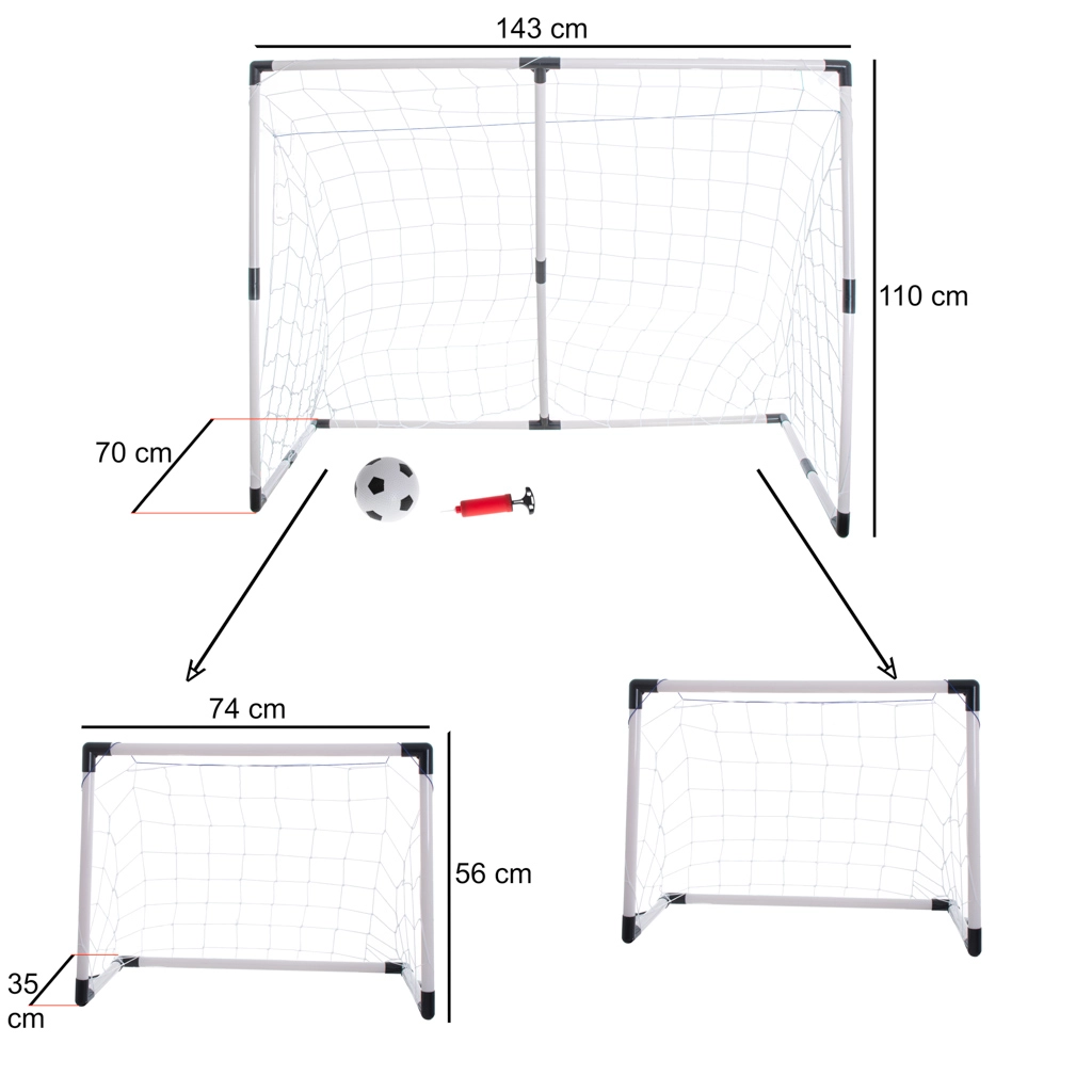See 2‑ühes jalgpallivärav on ideaalne väikestele jalgpalluritele, kes soovivad harjutada nii mänguoskusi kui ka lööke väravale. Ainulaadne disain võimaldab kokku panna ühe suure värava mõõtudega 143×110×70 cm või jagada selle kaheks väiksemaks väravaks mõõtudega 74×55×35 cm.