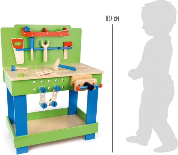 Töölaud on kindlalt kinnitatud ning sisaldab kruustange detailide fikseerimiseks. Lapsed saavad harjutada oskusi nagu naelutamine, kruvimine, mõõtmine ja saagimine.