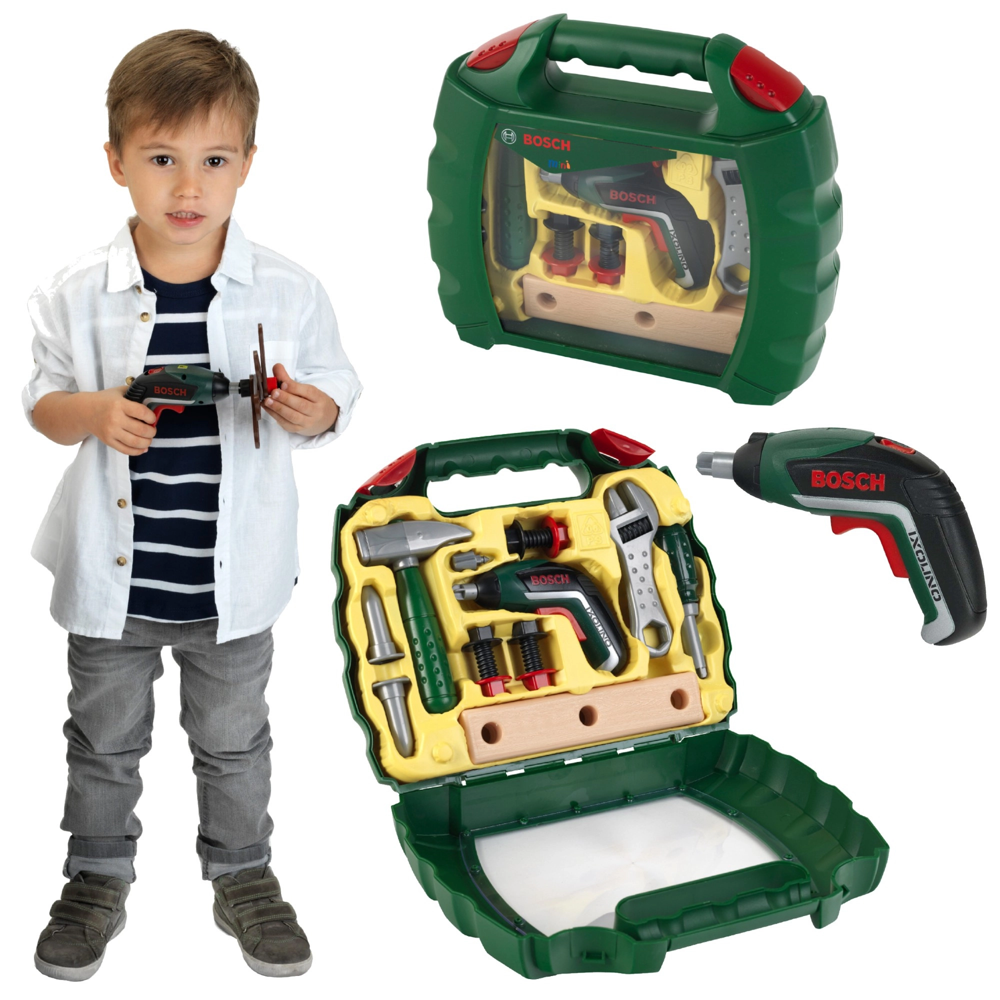 Stiilne laste tööriistakohver litsentseeritud BOSCH Mini sarjast kaubamärgilt Klein pakub realistlikku mängu väikestele parandajatele. Komplektis on patareidega töötav akukruvikeeraja Ixolino II, millel on parem- ja vasakpööre ning mootori heli, lisaks kruvikeeraja, mutrivõti, haamer, kruvid mutritega ja „puidust” plaadid kruvimise ja naelutamise harjutamiseks. Tugev tumesinine roheline kohver läbipaistva kaanega ja kahe punase lukuga hoiab kõik turvaliselt koos.