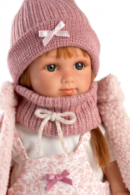 Nukk on riietatud lillelisse kleiti, mida täiendavad kootud kübar ja soojad sokid, luues elava ja rõõmsa välimuse.