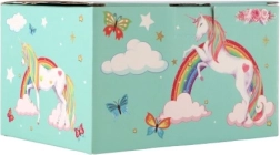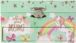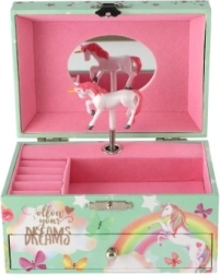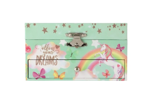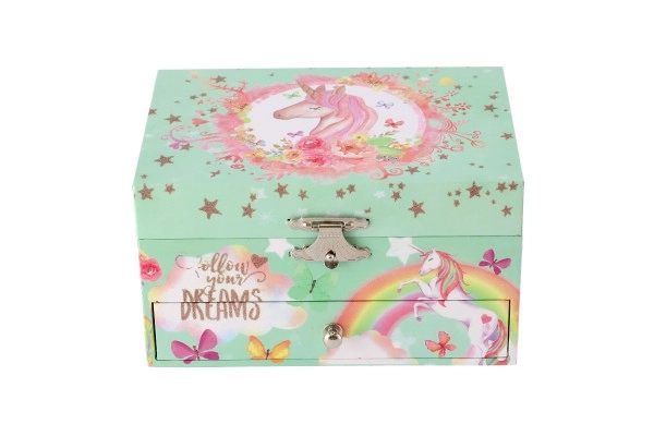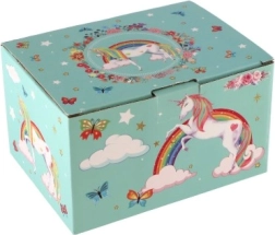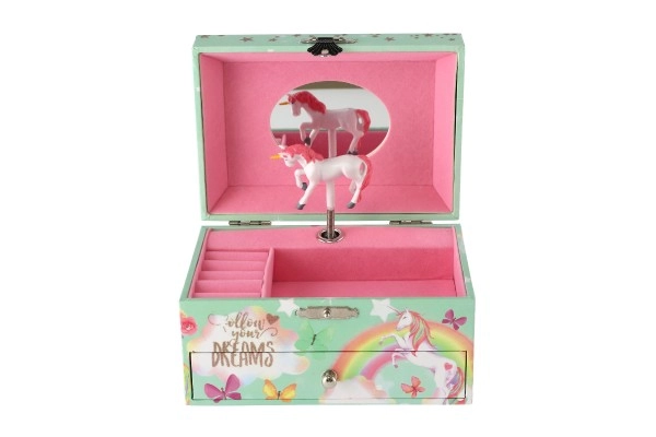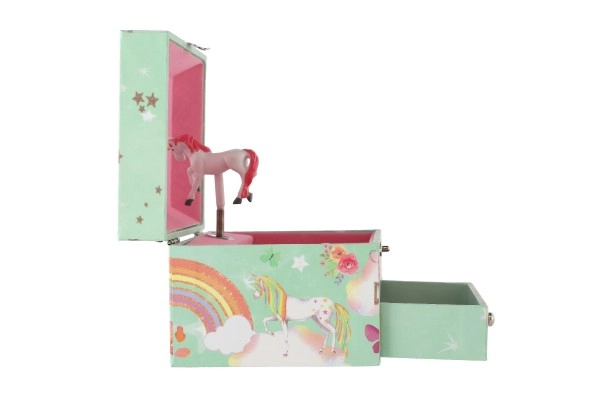 Võluv ükssarviku motiiviga pastellroheline muusikaline ehetekarp rõõmustab iga väikest ilmatari. Pärast võtme keeramist hakkab sees ükssarviku figuur pöörlema ning kõlab õrn meloodia. Seest leiab peegli, selged lahtrid ja praktilise sahtli pisikeste aardete jaoks. Vastupidav kartongkorpus, metallosad ja kaunid vikerkaare, tähtede ja liblikate illustratsioonid sobivad suurepäraselt lastetuppa.